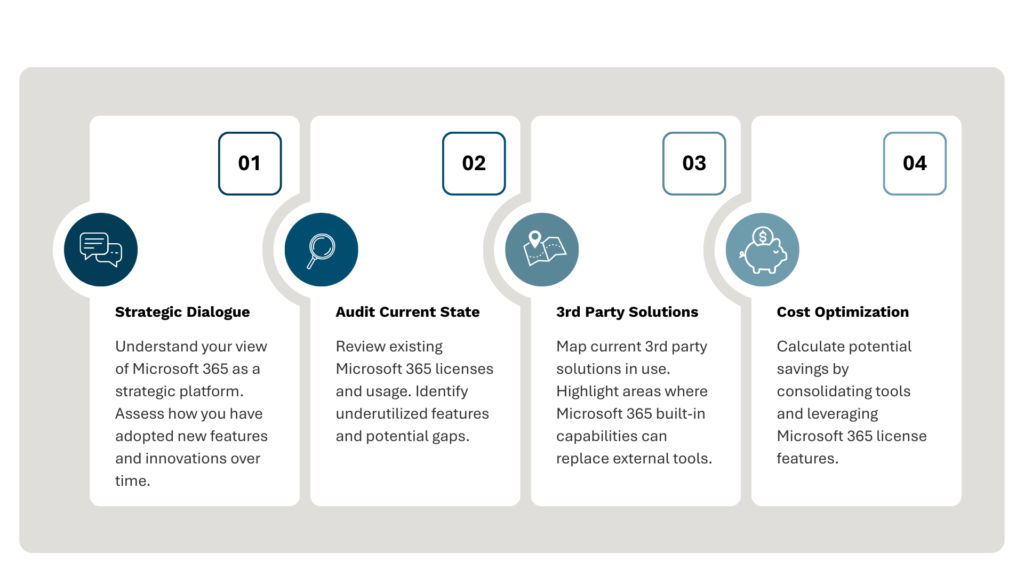 In this step we map all your third party solutions and highlight areas where Microsoft 365 can replace those silent budget drainers.